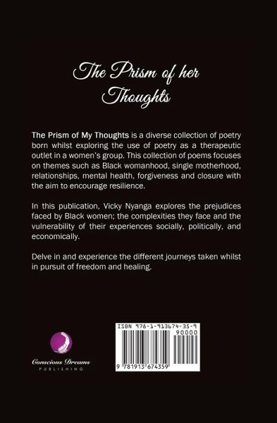 The Prism of Her Thoughts is a diverse collection of poetry born whilst exploring the use of poetry as a therapeutic outlet in a women's group. This collection of poems focuses on themes such as black womanhood, single motherhood, relationships, mental health, forgiveness and closure with the aim to encourage resilience. In this publication, Vicky Nyanga explores the prejudices faced by black women; the complexities they face and the vulnerability of their experiences socially, politically, and economically. Delve in and experience the different journeys taken whilst in pursuit of freedom and healing.