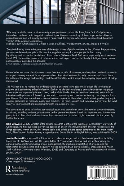 Foreword. Introduction 1. Prisoner Backgrounds and Biographies 2. Custody, Care and Staff-Prisoner Relationships 3. Prison Culture and the Prisoner Society 4. Identity and Adaptation in Prison 5. Prisoners and Their Families 6. Vulnerability, Struggling and Coping in Prison 7. Children and Young People in Custody 8. Ageing Prisoners 9. Women Prisoners 10. Cultural Diversity, Ethnicity and Race Relations in Prison 11. Rehabilitation, Generativity and Mutual Aid. Afterword