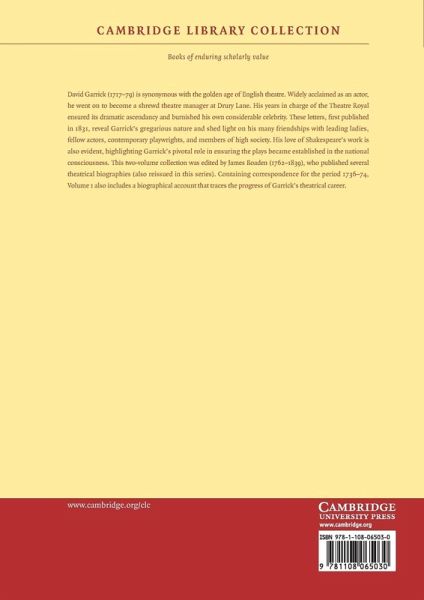 David Garrick (1717-79) is synonymous with the golden age of English theatre. Widely acclaimed as an actor, he went on to become a shrewd theatre manager at Drury Lane. His years in charge of the Theatre Royal ensured its dramatic ascendancy and burnished his own considerable celebrity. These letters, first published in 1831, reveal Garrick's gregarious nature and shed light on his many friendships with leading ladies, fellow actors, contemporary playwrights, and members of high society. His love of Shakespeare's work is also evident, highlighting Garrick's pivotal role in ensuring the plays became established in the national consciousness. This two-volume collection was edited by James Boaden (1762-1839), who published several theatrical biographies (also reissued in this series). Containing correspondence for the period 1736-74, Volume 1 also includes a biographical account that traces the progress of Garrick's theatrical career.