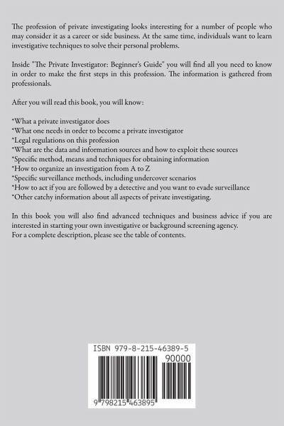 The profession of private investigating looks interesting for a number of people who may consider it as a career or side business. At the same time, individuals want to learn investigative techniques to solve their personal problems. Inside "The Private Investigator: Beginner's Guide" you will find all you need to know in order to make the first steps in this profession. The information is gathered from professionals. After you will read this book, you will know: *What a private investigator does *What one needs in order to become a private investigator *Legal regulations on this profession *What are the data and information sources and how to exploit these sources *Specific method, means and techniques for obtaining information *How to organize an investigation from A to Z *Specific surveillance methods, including undercover scenarios *How to act if you are followed by a detective and you want to evade surveillance *Other catchy information about all aspects of private investigating. In this book you will also find advanced techniques and business advice if you are interested in starting your own investigative or background screening agency. For a complete description, please see the table of contents.
