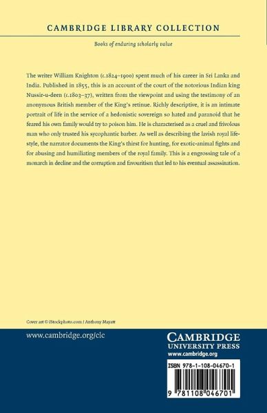The writer William Knighton (c.1824-1900) spent much of his career in Sri Lanka and India. Published in 1855, this is an account of the court of the notorious Indian King Nussir-u-deen (c.1803-37), written from the viewpoint and using the testimony of an anonymous British member of the King's retinue. Richly descriptive, it is an intimate portrait of life in the service of a hedonistic sovereign so hated and paranoid that he feared his own family would try to poison him. He is characterised as a cruel and frivolous man who only trusted his sycophantic barber. As well as describing the lavish royal lifestyle, the narrator documents the King's thirst for hunting, for exotic-animal fights and for abusing and humiliating members of the royal family. This is a lurid and engrossing tale of a monarch in decline and the corruption and favouritism that led to his eventual assassination.