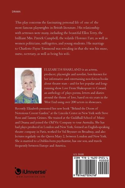 This play concerns the fascinating personal life of one of the most famous playwrights in British literature. His relationship with actresses were many, including the beautiful Ellen Terry, the brilliant Mrs. Patrick Campbell, the volatile Florence Farr, as well as women politicians, suffragettes, and young students. His marriage to Charlotte Payne Townsend was revealing in that she was his muse, nurse, secretary, as well as being his wife.