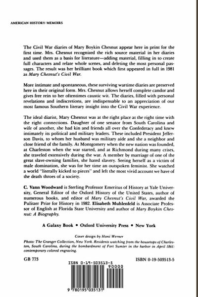 Pulitzer Prize-winning historian C. Vann Woodward and Chesnut's biographer Elisabeth Muhlenfeld present here the previously unpublished Civil War diaries of Mary Boykin Chesnut. The ideal diarist, Mary Chesnut was at the right place at the right time with the right connections. Daughter of one senator from South Carolina and wife of another, she had kin and friends all over the Confederacy and knew intimately its political and military leaders. At Montgomery when the new nation was founded, at Charleston when the war started, and at Richmond during many crises, she traveled extensively during the war. She watched a world "literally kicked to pieces" and left the most vivid account we have of the death throes of a society. The diaries, filled with personal revelations and indiscretions, are indispensable to an appreciation of our most famous Southern literary insight into the Civil War experience.