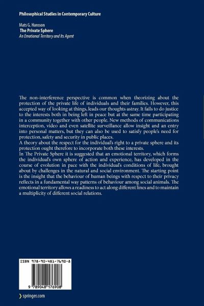 In The Private Sphere it is suggested that an emotional territory, which forms the individual's own sphere of action and experience, has developed in the course of evolution in pace with the individual's conditions of life, brought about by challenges in the natural and social environment. The starting point is the insight that the behaviour of human beings with respect to their privacy reflects in a fundamental way patterns of behaviour among social animals. The emotional territory allows a readiness to act along different lines and to maintain a multiplicity of different social relations.