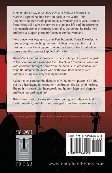 Vietnam didn't stay in Southeast Asia. It followed former U.S. Marine Corporal Nathan Henson back to the World-his hometown in the Florida panhandle. Seventeen years later, specters from 'Nam still haunt the corners of Nathan's life and the recurring nightmarish scenes of carnage won't die. Desperate, he seeks help and joins a support group for Vietnam combat veterans. Now a new war begins-against Post Traumatic Stress Disorder. In a series of gut-wrenching sessions, Nathan faces the ghosts of his past and shares the struggles of others as they confront and relive horrors and dark secrets kept locked inside. There's Vic Guerino, a former Army helicopter pilot trying to adjust to the boredom of a grounded life, Dan "Doc" Matthews, wrestling with addiction brought home from the battlefields of Vietnam, and Rene Boudreaux, the loner who withdraws from society with paranoia ruling his every waking moment. Nathan must conquer the demons of PTSD to win peace in his life, but it's a harrowing rollercoaster ride through the valley of healing. The path is strewn with heartbreak and humor, hope and despair and love lost and regained. This is the comeback story of a heroic young man who saw it all, lived through it, and ultimately emerged from the shadows of war.