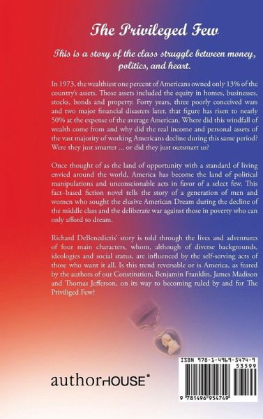This is a story of the class struggle between money, politics, and heart. In 1973, the wealthiest one percent of Americans owned only 13% of the country's assets. Those assets included the equity in homes, businesses, stocks, bonds and property. Forty years, three poorly conceived wars and two major financial disasters later, that figure has risen to nearly 50% at the expense of the average American. Where did this windfall of wealth come from and why did the real income and personal assets of the vast majority of working Americans decline during this same period? Were they just smarter ... or did they just outsmart us? Once thought of as the land of opportunity with a standard of living envied around the world, America has become the land of political manipulations and unconscionable acts in favor of a select few. This fact-based fiction novel tells the story of a generation of men and women who sought the elusive American Dream during the decline of the middle class and the deliberate war against those in poverty who can only afford to dream. R.R. DeBenedictis's story is told through the lives and adventures of four main characters, whom, although of diverse backgrounds, ideologies and social status, are influenced by the self-serving acts of those who want it all. Is this trend reversable or is America, as feared by the authors of our Constitution, Benjamin Franklin, James Madison and Thomas Jefferson, on its way to becoming ruled by and for The Priviliged Few?