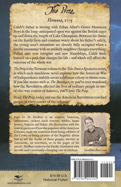 The Biggest Heroes are Sometimes Unsung Caleb's father is serving with Ethan Allen's Green Mountain Boys as the long-anticipated open war against the British rages up and down the length of Lake Champlain. Between his duties on the family farm and constant worry about his father's safety, the young man's attentions are already fully occupied when a fateful encounter with an unlikely neighbor changes everything. Pulled into new intrigues and new friendships, Caleb finds himself on a path that changes his life - and which will affect the outcome of the whole war. The Prize is the standalone Vermont novel in the Tales From a Revolution series, in which each volume explores how the American War of Independence unfolds across a different colony or future state. If you like stories such as The Deerslayer, or you've ever wondered how the Revolution affected the lives of ordinary people in out-of-the-way corners of America, you'll love The Prize. Read The Prize today, and see the American Revolution from a completely different point of view!