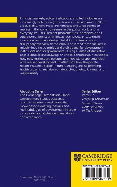 Financial markets, actors, institutions and technologies are increasingly determining which kinds of services and 'welfare' are available, how these are narrated, and what comes to represent the 'common sense' in the policy world and in everyday life. This Element problematises the rationale and operation of one such financial technology, private health insurance, and the industry it inhabits. It offers a cross-disciplinary overview of the various drivers of these markets in middle-income countries and their appeal for development institutions and for governments. Using a range of illustrative case examples and drawing on critical scholarship it considers how new markets are pursued and how states are entangled with market development. It reflects on how the private health insurance sector in turn is shaping and segmenting health systems, and also our ideas about rights, fairness and responsibility.