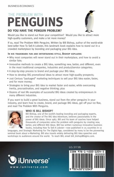 Would you like to attract more high-quality customers and make a lot more money? If so, The Problem with Penguins, written by Bill Bishop, author of the bestseller How to Sell a Lobster, can help you with your penguin problem! Learn how to stand out in a crowded marketplace by effectively branding and packaging your BIG Idea. In his trademark fun and entertaining style, Bishop explains: Why most companies will never stand out in their marketplace, and how to avoid a similar fate; Innovative methods to create a BIG Idea, something new, better, and different, even in the most traditional companies, industries and product/service categories; A step-by-step process to brand and package your BIG Idea; How to develop BIG promotional ideas to attract more high-quality prospects; Twenty-first Century "packaged" marketing techniques to sell your BIG Idea easier, faster, and for more money; Strategies to bring your BIG Idea to market faster and easier, while overcoming inertia, procrastination, and negative thinking; plus Dozens of real life examples of successful BIG Ideas created by entrepreneurs in many different industries. Start today to build a great business and stand out from the other penguins in your industry!