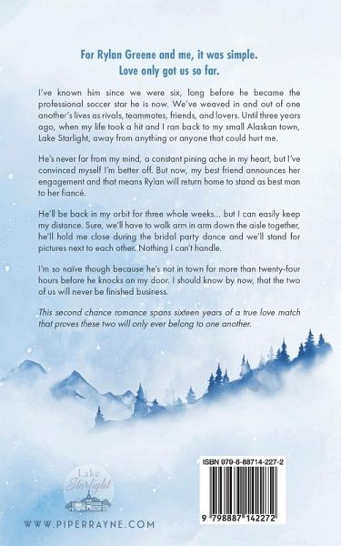 For Rylan Greene and me, it was simple. Love only got us so far. I've known him since we were six, long before he became the professional soccer star he is now. We've weaved in and out of one another's lives as rivals, teammates, friends, and lovers. Until three years ago, when my life took a hit and I ran back to my small Alaskan town, Lake Starlight, away from anything or anyone that could hurt me. He's never far from my mind, a constant pining ache in my heart, but I've convinced myself I'm better off. But now, my best friend announces her engagement and that means Rylan will return home to stand as best man to her fiancé. He'll be back in my orbit for three whole weeks... but I can easily keep my distance. Sure, we'll have to walk arm in arm down the aisle together, he'll hold me close during the bridal party dance and we'll stand for pictures next to each other. Nothing I can't handle. I'm so naïve though because he's not in town for more than twenty-four hours before he knocks on my door. I should know by now, that the two of us will never be finished business. This second chance romance spans sixteen years of a true love match that proves these two will only ever belong to one another.