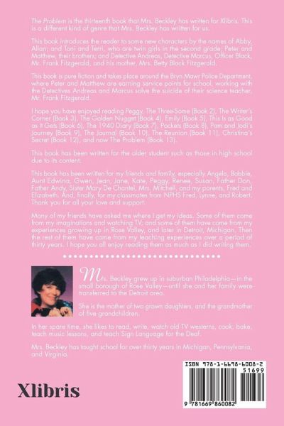 The Problem is the thirteenth book that Mrs. Beckley has written for Xlibris. This is a different kind of genre that Mrs. Beckley has written for us. This book introduces the reader to some new characters by the names of Abby, Allan; and Toni and Terri, who are twin girls in the second grade; Peter and Matthew, their brothers; and Detective Andreas, Detective Marcus, Officer Black, Mr. Frank Fitzgerald, and his mother, Mrs. Betty Black Fitzgerald. This book is pure fiction and takes place around the Bryn Mawr Police Department, where Peter and Matthew are earning service points for school, working with the Detectives Andreas and Marcus solve the suicide of their science teacher, Mr. Frank Fitzgerald. I hope you have enjoyed reading Peggy, The Three-Some (Book 2), The Writer's Corner (Book 3), The Golden Nugget (Book 4), Emily (Book 5), This Is as Good as It Gets (Book 6), The 1940 Diary (Book 7), Pockets (Book 8), Pam and Jodi's Journey (Book 9), The Journal (Book 10), The Reunion (Book 11), Christina's Secret (Book 12), and now The Problem (Book 13). This book has been written for the older student such as those in high school due to its content. This book has been written for my friends and family, especially Angela, Bobbie, Aunt Edwina, Gwen, Jean, Jane, Kate, Peggy, Renee, Susan, Father Don, Father Andy, Sister Mary De Chantel, Mrs. Mitchell, and my parents, Fred and Elizabeth. And, finally, for my classmates from NPHS Fred, Lynne, and Robert. Thank you for all your love and support. Many of my friends have asked me where I get my ideas. Some of them come from my imaginations and watching TV, and some of them have come from my experiences growing up in Rose Valley, and later in Detroit, Michigan. Then the rest of them have come from my teaching experiences over a period of thirty years. I hope you all enjoy reading them as much as I did writing them.