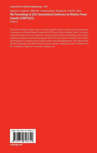 This book includes original, peer-reviewed research papers from the 2023 International Conference on Wireless Power Transfer (ICWPT2023), held in Weihai, China. The topics covered include but are not limited to: wireless power transfer technology and systems, coupling mechanism and electromagnetic field of wireless power transfer systems, latest developments in wireless power transfer system, and wide applications. The papers share the latest findings in the field of wireless power transfer, making the book a valuable asset for researchers, engineers, university students, etc.
