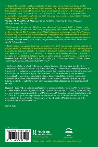 "Building on the introduction of his Foursquare Coaching Framework (FsCF) in Coaching as a Leadership Style, Robert Hicks provides a unique journey from psychological theory to master of the coaching art. The Process of Highly Effective Coaching integrates theories from Socrates to Berne, Rogers, Schön, and many others with the practical, non-linear framework of the FsCF model, which allows coaches to transform from linear thinkers to master coaching practitioners."