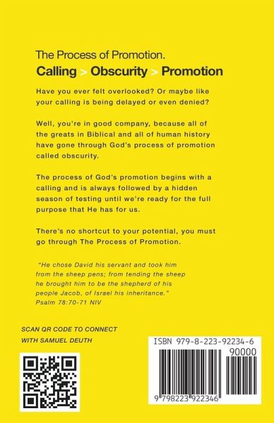 Have you ever felt overlooked? Or maybe your calling is being delayed or even denied? Well, you're in good company, because all of the greats in Biblical and truly throughout human history have gone through God's process of promotion called obscurity. The process of God's promotion begins with a calling and is always followed by a hidden season of testing until we're ready for the full purpose that He has for us. There's no shortcut to your potential, you must go through The Process of Promotion. The challenge often is that as we're walking through these obscure seasons it's easy to get distracted, discouraged or disillusioned and then quit. But, God designed this season to make you not break you! This season is not because he's mad at you but because He loves you and has a massive plan for you that could break you if you're not ready for it! In this book, you're going to learn about the nine ways that God uses obscurity to prepare you for your purpose. Each of these areas have been specifically worked through in my own journey over the last several decades of my life. I get honest and personal in how God has applied and work through each part of the process of promotions. The nine ways are:The Repetition of Obscurity The Darkness of Obscurity The Invisibility of Obscurity The Quietness of Obscurity The Clarity of Obscurity The Separation of Obscurity The Length of Obscurity The Danger of Obscurity The Reward of Obscurity The Process of Promotion is: Calling > Obscurity > Promotion. I'm praying that you are encouraged as you read this book and I'd love to hear from you after you read the book. Come find me on social media: anywhere with the username: @samueldeuth May you find God's incredible guiding hand even in the hidden seasons that He's leading you through on your way to your purpose and calling!