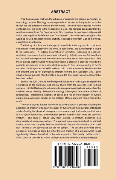 This thesis argues that with the advance of scientific knowledge, particularly in cosmology, Natural Theology can now provide an answer to the question as to the reason for the existence of man and the world. Aristotle had reasoned from the contingency of the world to the necessity of a God. He had also concluded that the world was unworthy of God's concern, as God could not be concerned with a world which was significantly different from God himself. Aristotle's reasoning from the world up to God, together with his inability to reason down from God to the world, established an antinomy. The history of subsequent attempts to avoid this antinomy, and to provide an explanation for the existence of the world, is considered. No such attempt is found to be successful. A hidden assumption in Aristotle's reasoning is exposed. Aristotle's conclusion that the world was not worthy of God's concern followed from his unstated assumption that the world was complete, rather than in process. The thesis argues that the world we know represents a stage in a process towards the possible self-creation of an entity which is similar to God, and so worthy of God's concern. Only a process of self-creation could produce an entity which would be self-existent, and so not significantly different from the self-subsistent God. Each stage of such a process of self-creation, before the final stage, would necessarily be less than perfect. Early in the 20th Century the Emergent Evolutionists had sought to explain the emergence of the biological and mental levels from the material level, without success. Nicolai Hartmann's subsequent ontological investigations made clear the stratified nature of reality. Hartmann's ontology is brought to bear on the problem of Emergence. Hartmann's analysis of ethics and his phenomenology of human nature are also brought to bear on the problem of the nature and role of man in the world. The thesis argues that the world can be understood as a process involving the possible self-creation of an entity like God. In the series of the emergent ontological strata of reality, the physical, biological, conscious and spiritual strata, each stratum is less rigidly determined, and exercises greater freedom than does the previous stratum. The laws of nature vary from stratum to stratum, becoming less deterministic at each new stratum. The present human moral-cultural, or spiritual stratum, exercises complete freedom in relation to the law of this stratum, the moral law. The moral law commands but can not compel. The possible outcomes of this process of Emergence could be either the self-creation of a stratum which is not significantly different from God, or the self-destruction of humanity. In this context, Christ could be considered to be a proleptic exemplar of the final emergent stage.