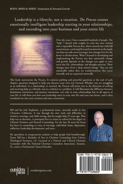 Leadership is a lifestyle, not a vocation. The Process creates emotionally intelligent leadership starting in your relationships, and extending into your business and your entire life Over the years, I have counseled hundreds of people. The "help" I shared with couples in crisis has now evolved into a repeatable Process that, when entered into with full commitment, can bring life transformation from the inside out that not only saves marriages, but changes lives for the better in all directions. What I learned in developing and implementing the Process was that sustainable change and growth depends on the changes you apply to your every-day life, relationships, and thought patterns. These changes stem from a deep inward change. They are not sustainable unless they are transformations that occur inwardly and are expressed outwardly. This book summarizes the Process. It contains probing and powerful questions at the end of each chapter, questions designed to help you discover your own way forward. Whether you are struggling as an individual, in a relationship, or married, the Process will point you in the direction of seeking and receiving help as a lifestyle, not as a solution to a problem. It will illuminate the difference between destination orientation, and journey orientation, not only in your relationships but in all aspects of your life. It will show you how true leadership starts in your own life and your own home, and is then translated out into your vocation and your community.