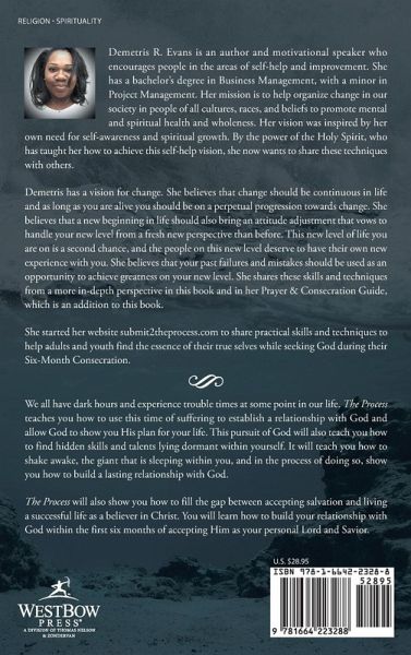 We all have dark hours and experience trouble times at some point in our life. The Process teaches you how to use this time of suffering to establish a relationship with God and allow God to show you His plan for your life. This pursuit of God will also teach you how to find hidden skills and talents lying dormant within yourself. It will teach you how to shake awake, the giant that is sleeping within you, and in the process of doing so, show you how to build a lasting relationship with God. The Process will also show you how to fill the gap between accepting salvation and living a successful life as a believer in Christ. You will learn how to build your relationship with God within the first six months of accepting Him as your personal Lord and Savior.