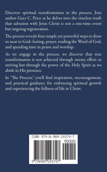 Discover spiritual transformation in the process. Join author Gary C. Price as he delves into the timeless truth that salvation with Jesus Christ is not a one-time event but ongoing regeneration. The process reveals four simple yet powerful steps to draw us near to God: fasting, prayer, reading the Word of God, and spending time in praise and worship. As we engage in the process, we discover that true transformation is not achieved through sweaty effort or striving but through the power of the Holy Spirit as we abide in His presence. In "The Process," you'll find inspiration, encouragement, and practical guidance for embracing spiritual growth and experiencing the fullness of life in Christ.