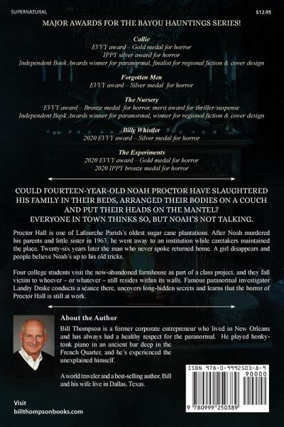 COULD FOURTEEN-YEAR-OLD NOAH PROCTOR HAVE SLAUGHTERED HIS FAMILY IN THEIR BEDS, ARRANGED THEIR BODIES ON A COUCH AND PUT THEIR HEADS ON THE MANTEL?EVERYONE IN TOWN THINKS SO, BUT NOAH'S NOT TALKING. Proctor Hall is one of Lafourche Parish's oldest sugarcane plantations. After Noah supposedly murdered his parents and little sister in 1963, he went off to an institution while caretakers maintained the place. Twenty-six years later, the man who never spoke returned home. A girl disappears and people believe Noah's up to his old tricks. Four college students visit the now-abandoned farmhouse as part of a class project, and they fall victim to whoever -- or whatever -- still resides within its walls. Famous paranormal investigator Landry drake conducts a seance there, uncovers long-hidden secrets and learns that the horror of Proctor Hall is still at work.