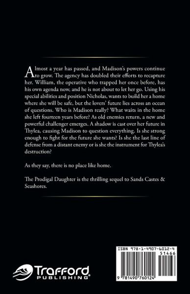 Almost a year has passed, and Madison's powers continue to grow. The agency has doubled their efforts to recapture her. William, the operative who trapped her once before, has his own agenda now, and he is not about to let her go. Using his special abilities and position Nicholas, wants to build her a home where she will be safe, but the lovers' future lies across an ocean of questions. Who is Madison really? What waits in the home she left fourteen years before? As old enemies return, a new and powerful challenger emerges. A shadow is cast over her future in Thylea, causing Madison to question everything. Is she strong enough to fight for the future she wants? Is she the last line of defense from a distant enemy or is she the instrument for Thylea's destruction? As they say, there is no place like home. The Prodigal Daughter is the thrilling sequel to Sands Castes & Seashores.