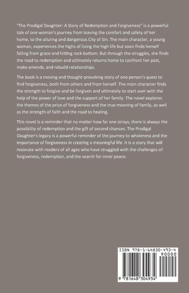 "The Prodigal Daughter: A Story of Redemption and Forgiveness" is a powerful tale of one woman's journey from leaving the comfort and safety of her home, to the alluring and dangerous City of Sin. The main character, a young woman, experiences the highs of living the high life but soon finds herself falling from grace and hitting rock bottom. But through the struggles, she finds the road to redemption and ultimately returns home to confront her past, make amends, and rebuild relationships. The book is a moving and thought-provoking story of one person's quest to find forgiveness, both from others and from herself. The main character finds the strength to forgive and be forgiven and ultimately to start over with the help of the power of love and the support of her family. The novel explores the themes of the price of forgiveness and the true meaning of family, as well as the strength of faith and the road to healing. This novel is a reminder that no matter how far one strays, there is always the possibility of redemption and the gift of second chances. The Prodigal Daughter's legacy is a powerful reminder of the journey to wholeness and the importance of forgiveness in creating a meaningful life. It is a story that will resonate with readers of all ages who have struggled with the challenges of forgiveness, redemption, and the search for inner peace.