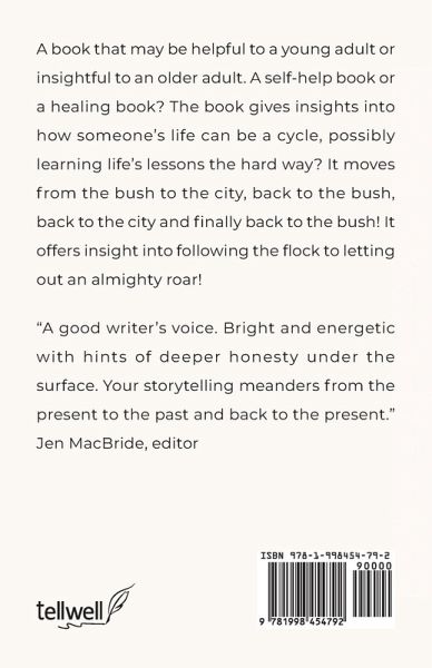 A book that may be helpful to a young adult or insightful to an older adult. A self-help book or a healing book? The book gives insights into how someone's life can be a cycle, possibly learning life's lessons the hard way? It moves from the bush to the city, back to the bush, back to the city and finally back to the bush! It offers insight into following the flock to letting out an almighty roar! "A good writer's voice. Bright and energetic with hints of deeper honesty under the surface. Your storytelling meanders from the present to the past and back to the present." Jen MacBride, editor