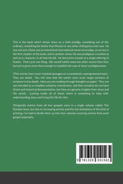 This is the book which shows Jesus as a child prodigy, something out of the ordinary, something far better than Mozart or any other child genius ever was. He was not just a fluke, but an intentional international universal prodigy, as we see in the first chapter of the book, and in another sense, He was prodigious in extent as well as in character in all that He did. He fed entire crowds at a single offering of thanks. That's just one thing. We would hardly need any other record than that, but we're given more than enough to establish the case of Jesus' prodigiousness. The entries here cover isolated passages on a completely unprogrammed basis. They are dated. You will note that the earlier ones cover larger portions of scripture in less depth. Here you are reading through thoughts on paper. They are not intended as a complete scholarly commentary, and they certainly do not have Greek and historical documentation, but they are genuine insights from Jesus and His words. Lurking inside all of these, there is something to help with understanding Jesus and living this life for Him. Originally entries from all four gospels were in a single volume called, The Pointed Jesus, but due to increasing entries and the size limitations of this kind of printing, I've had to divide them up into four volumes covering entries from each gospel separately.