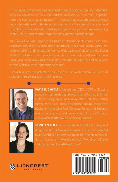 In the digital economy, businesses need to adapt quickly to satisfy customers’ constant demands for new and updated products. But too many organizations are held back by antiquated IT mindsets that separate developmental groups from the rest of the team. To stay ahead of the competition, you need to embrace enterprise-wide thinking that gets everyone—from engineering to the C-suite—on the same page and speaking the same language. The Product Mindset approaches product development from a bold, new direction, based on a shared internal outlook that drives focus, speed, experimentation, and innovation from a wide variety of stakeholders. David DeWolf and Jessica Hall provide you with all the tools you’ll need to revitalize your company’s methodologies, reframe its culture, and help your company thrive in the digital marketplace. If your business is shackled to an IT mindset, break free from the past and discover the fast track to future success.