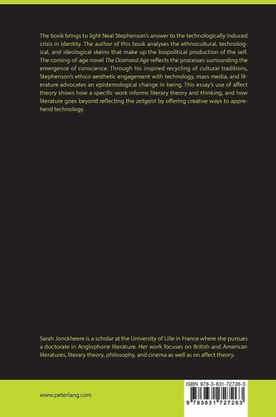 The book brings to light Neal Stephenson's answer to the technologically induced crisis in identity. The author of this book analyses the ethnocultural, technological, and ideological skeins that make up the biopolitical production of the self. The coming-of-age novel «The Diamond Age» reflects the processes surrounding the emergence of conscience. Through his inspired recycling of cultural traditions, Stephenson's ethico-aesthetic engagement with technology, mass media, and literature advocates an epistemological change in being. This essay's use of affect theory shows how a specific work informs literary theory and thinking, and how literature goes beyond reflecting the «zeitgeist» by offering creative ways to apprehend technology.