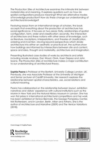 The Production Sites of Architecture examines the intimate link between material sites and meaning. It explores questions such as: how do spatial configurations produce meaning? What are alternative modes of knowledge production? How do these change our understanding of architectural knowledge? Featuring essays from an international range of scholars, the book accepts that everything about the production of architecture has social significance. It focuses on two areas: firstly, relationships of spatial configuration, form, order and classification; secondly, the interaction of architecture and these notions with other areas of knowledge, such as literature, inscriptions, interpretations, and theories of classification, ordering and invention. Moving beyond perspectives which divide architecture into either an aesthetic or practical art, the authors show how buildings are informed by intersections between site and content, space and idea, thought and materiality, architecture and imagination. Presenting illustrated case studies of works by architects and artists including Amale Andraos, Dan Wood, OMA, Koen Deprez and John Soane, The Production Sites of Architecture makes a major contribution to our understanding of architectural theory.