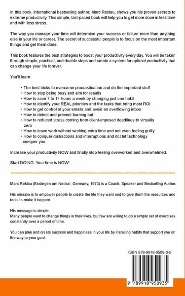 Double Your Productivity with these habits. Are you tired of losing focus, procrastinating, and leaving projects unfinished? What if you could dramatically increase your productivity? What if you could stop being overwhelmed and get an extra hour a day to do the things you love? What would finally having time to spend with your family, some alone time to read, or exercise mean to you? In this book, international bestselling author Marc Reklau shows you his proven secrets to extreme productivity. Learn the best strategies to overcome procrastination, improve your mindset, and achieve your goals. More than anything else in your life or career, the way you manage your time will determine your success or failure. It's simple: The better you use your time, the more you will get accomplished, hence the more you will earn. The secret of successful people is to focus on the most important things on their to-do lists and actually do them. This simple, fast-paced e-Book will help you to get more done in less time and with less stress. It will take you through simple, practical, and doable steps and create a system for optimal productivity that can change your life forever. You'll do things faster - and even more importantly - you will do the right things! (Most people don't have time because they waste it on doing unimportant stuff) You'll learn: How to use your to-do lists correctly The best tricks to overcome procrastination and do the important stuff How to stop being busy and aim for results How to save 7 to 14 hours a week by changing just one habit. How to identify your REAL priorities and the tasks that bring most ROI How to get control of your emails and avoid an overflowing inbox How to detect and prevent burning out How to reduce stress from client-imposed deadlines to virtually zero and much more!