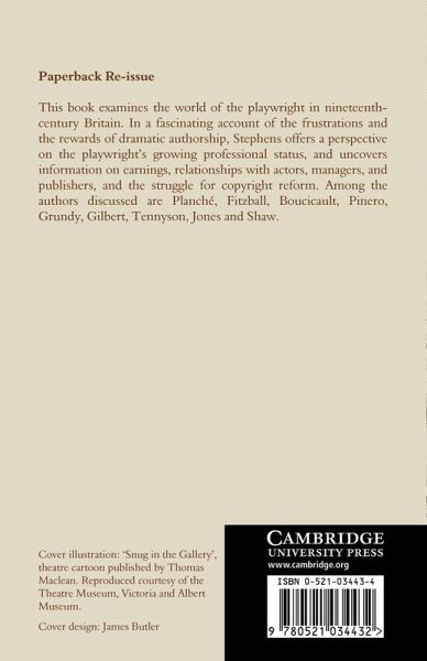 This book examines the working world of the playwright in nineteenth-century Britain. It was often a risky and financially uncertain profession, yet the magic of the theatre attracted authors from widely different backgrounds - journalists, lawyers, churchmen, civil servants, printers and actors, as well as prominent poets and novelists. In a fascinating account of the frustrations and the rewards of dramatic authorship, Stephens uncovers information on the playwright's earnings, relationships with actors, managers, publishers and audience, and offers a perspective on his growing status as a professional. Further chapters focus on the struggle for copyright reform and the complexities of dramatic publishing. A large number of major and minor authors are discussed, among them Planche, Fitzball, Boucicault, Pinero, Grundy, Gilbert, Jones and Shaw.