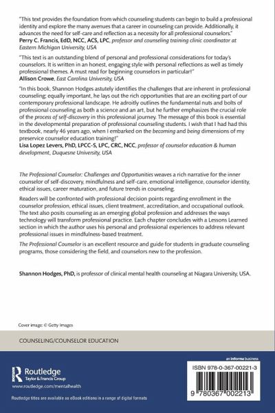 The Professional Counselor: Challenges and Opportunities weaves a rich narrative for the inner counselor of self-discovery, mindfulness and self-care, emotional intelligence, counselor identity, ethical issues, career maturation, and future trends in counseling. Readers will be confronted with professional decision points regarding enrollment in the counselor profession, ethical issues, client treatment, accreditation, and occupational outlook. The text also posits counseling as an emerging global profession and addresses the ways technology will transform professional practice. Each chapter concludes with a Lessons Learned section in which the author uses his personal and professional experiences to address relevant professional issues in mindfulness-based treatment. The Professional Counselor is an excellent resource and guide for students in graduate counseling programs, those considering the field, and counselors new to the profession.