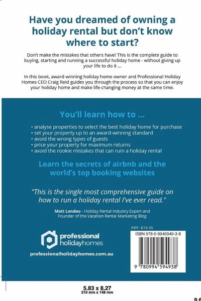 Have you dreamed of owning a holiday rental but don't know where to start? Don't make the mistakes that others do! This is the complete guide to buying, starting and running a successful holiday home - without giving up your life to do it ... In this book, award-winning holiday home owner and Professional Holiday Homes CEO Craig Reid guides you through the process so that you can enjoy your holiday home and make life-changing money at the same time. You'll learn how to ... analyse properties to select the best holiday home for purchase set your property up to an award-winning standard avoid the wrong types of guests price your property for maximum returns avoid the rookie mistakes that can ruin a holiday rental Learn the secrets of airbnb and the world's top booking websites