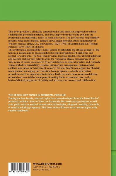 This book provides the first clinically comprehensive and practical approach to ethical challenges in perinatal medicine. The first chapter introduces and explains the professional responsibility model of perinatal ethics. The professional responsibility model is based on the medical ethics of two major physician-ethics in the history of Western medical ethics, Dr. John Gregory (1724-1773) of Scotland and Dr. Thomas Percival (1740-1804) of England. The professional responsibility model is used to articulate the ethical concept of the fetus as a patient and to operationalize the ethical principles of beneficence and respect for autonomy. The book provides practical guidance for clinical judgment and decision making with patients about the responsible clinical management of the wide range of issues encountered by perinatologists in clinical practice and research. Topics included: periviability; feticide; intrapartum management; maternal-fetal conflict; innovation for fetal benefit; research for fetal benefit; non-aggressive obstetric management; managing the transition from pregnancy to birth; destructive procedures such as cephalocentesis; critical care for the pregnant patient; home birth; patient-choice cesarean delivery; neonatal care as a trial of management; and setting limits on neonatal care on the basis of clinical judgments of futility.