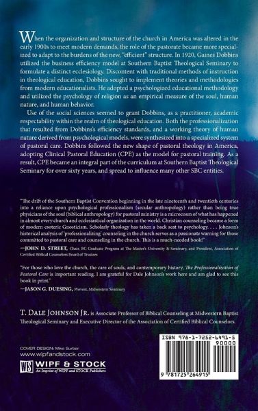 When the organization and structure of the church in America was altered in the early 1900s to meet modern demands, the role of the pastorate became more specialized to adapt to the burdens of the new, ""efficient"" structure. In 1920, Gaines Dobbins utilized the business efficiency model at Southern Baptist Theological Seminary to formulate a distinct ecclesiology. Discontent with traditional methods of instruction in theological education, Dobbins sought to implement theories and methodologies from modern educationalists. He adopted a psychologized educational methodology and utilized the psychology of religion as an empirical measure of the soul, human nature, and human behavior. Use of the social sciences seemed to grant Dobbins, as a practitioner, academic respectability within the realm of theological education. Both the professionalization that resulted from Dobbins's efficiency standards, and a working theory of human nature derived from psychological models, were synthesized into a specialized system of pastoral care. Dobbins followed the new shape of pastoral theology in America, adopting Clinical Pastoral Education (CPE) as the model for pastoral training. As a result, CPE became an integral part of the curriculum at Southern Baptist Theological Seminary for over sixty years, and spread to influence many other SBC entities.