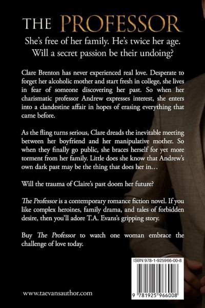 She’s free of her family. He’s twice her age. Will a secret passion be their undoing? Clare Brenton has never experienced real love. Desperate to forget her alcoholic mother and start fresh in college, she lives in fear of someone discovering her past. So when her charismatic professor Andrew expresses interest, she enters into a clandestine affair in hopes of erasing everything that came before. As the fling turns serious, Clare dreads the inevitable meeting between her boyfriend and her manipulative mother. So when they finally go public, she braces herself for yet more torment from her family. Little does she know that Andrew’s own dark past may be the thing that does her in… Will the trauma of Claire’s past doom her future? The Professor is a contemporary romance fiction novel. If you like complex heroines, family drama, and tales of forbidden desire, then you’ll adore T.A. Evans’s gripping story. Buy The Professor to watch one woman embrace the challenge of love today.