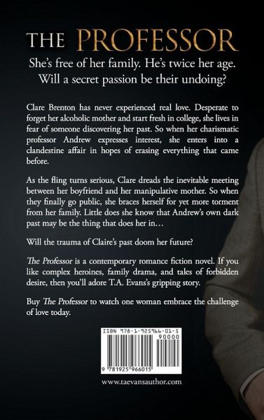 She’s free of her family. He’s twice her age. Will a secret passion be their undoing? Clare Brenton has never experienced real love. Desperate to forget her alcoholic mother and start fresh in college, she lives in fear of someone discovering her past. So when her charismatic professor Andrew expresses interest, she enters into a clandestine affair in hopes of erasing everything that came before. As the fling turns serious, Clare dreads the inevitable meeting between her boyfriend and her manipulative mother. So when they finally go public, she braces herself for yet more torment from her family. Little does she know that Andrew’s own dark past may be the thing that does her in… Will the trauma of Claire’s past doom her future. The Professor is a contemporary romance fiction novel. If you like complex heroines, family drama, and tales of forbidden desire, then you’ll adore T.A. Evans’s gripping story. Buy The Professor to watch one woman embrace the challenge of love today.