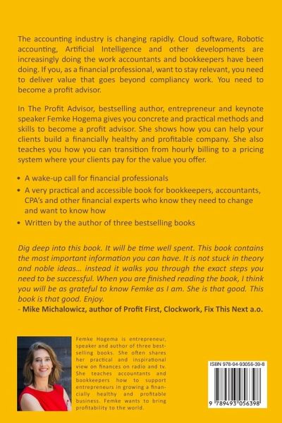 The accounting industry is changing rapidly. Cloud software, Robotic accounting, Artificial Intelligence and other developments are increasingly doing the work accountants and bookkeepers have been doing. If you, as a financial professional, want to stay relevant, you need to deliver value that goes beyond compliancy work. You need to become a profit advisor. In The Profit Advisor bestselling author, entrepreneur and keynote speaker Femke Hogema, gives you concrete and practical methods and skills to become a profit advisor. She shows you how you can help your clients build a financially healthy and profitable company. She also learns you how you can transition from hourly billing to a pricing system where your clients pay you for the value you offer. A wake-up call for financial professionals A very practical and accessible book for bookkeepers, accountants, CPA’s and other financial experts who know they need to change and want to know how Written by the author of three bestselling books Dig deep into this book. It will be time well spent. This book contains the most important information you can have. It is not stuck in theory and noble ideas… instead it walks you through the exact steps you need to be successful. When you are finished reading the book, I think you will be as grateful to know Femke as I am. She is that good. This book is that good. Enjoy. - Mike Michalowicz, author of Profit First.