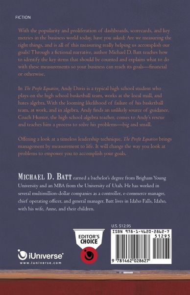 With the popularity and proliferation of dashboards, scorecards, and key metrics in the business world today, have you asked: Are we measuring the right things, and is all of this measuring really helping us accomplish our goals? Through a fictional narrative, author Michael D. Batt teaches how to identify the key items that should be counted and explains what to do with these measurements so your business can reach its goals-financial or otherwise. In The Profit Equation, Andy Davis is a typical high school student who plays on the high school basketball team, works at the local mall, and hates algebra. With the looming likelihood of failure of his basketball team, at work, and in algebra, Andy finds an unlikely source of guidance. Coach Hunter, the high school algebra teacher, comes to Andy's rescue and teaches him a process to solve his problems-big and small. Offering a look at a timeless leadership technique, The Profit Equation brings management by measurement to life. It will change the way you look at problems to empower you to accomplish your goals.