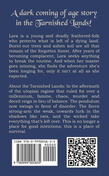 Lara is a young and deadly feathered-folk who protects what is left of a dying land. Burnt-out trees and ashen soil are all that remain of the forgotten forest. After years of becoming complacent, Lara seeks anything to break the routine. And when her master goes missing, she finds the adventure she's been longing for, only it isn't at all as she expected. This the second story in The Tarnished Lands series. It can be read without reading the first book, "The Harrowed Half-Breed." About The Tarnished Lands: In the aftermath of the utopian regime that ruled for over a millennium, famine, chaos, murder and deceit reign in lieu of balance. The pendulum now swings in favor of disorder. The fierce strong-arm the weak, cowards lurk in the shadows like rats, and the wicked take everything that’s left over. This is no longer a place for good intentions; this is a place of survival.
