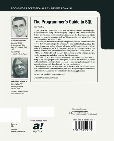 The Programmer's Guide to SQL provides an in-depth yet concise tutorial on the use of Structured Query Language (SQL). Once you've mastered the fundamentals, the book serves as a handy desktop reference on SQL usage, covering all of the major SQL statements that youll need when programming databases. It also comes complete with example code for five major database systems: SQL Server, Oracle, DB2, MySQL, and Access.
