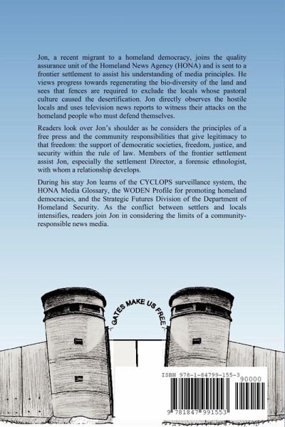 Jon, a recent migrant to a homeland democracy joins the quality assurance unit of the Homeland News Agency (HONA) and is sent to a frontier settlement to assist his understanding of media principles. He views progress towards regenerating the bio-diversity of the land and sees that fences are required to exclude the locals whose pastoral culture caused the desertification. Jon observes the hostile locals and witnesses their attacks on the homeland people who must defend. Jon considers the principles of a free press and the community responsibilities that give legitimacy to that freedom: the support of democracy, freedom, justice and security within the law, and begins a relationship with the settlement Director, a forensic ethnologist. As the conflict between settlers and locals intensifies, readers join Jon in considering the limits of a community-responsible news media.