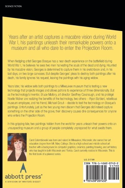 Years after an artist captures a macabre vision during World War I, his paintings unleash their remarkable powers onto a museum and all who dare to enter the Projection Room. When fledgling artist Georges Bosque has a near-death experience on the battlefield during World War I, he believes he sees two men harvesting the souls of the dead and dying. Haunted by his macabre vision, Georges is determined to capture them in his sketchbook and, in his last days, on two large canvases. But despite Georges' pleas to destroy both paintings after his death, his family ignores his request, leaving the paintings with his aging widow. Years later, his widow sells both paintings to a Milwaukee museum that is testing a new technology that projects images and allows patrons to experience art three dimensionally. But as the technology's inventor, Bruce Mallory, art director Geoffrey Cavanaugh, and his protégé Noelle Walker are realizing the benefits of the technology, two others-Ryan Barbieri, rebellious museum employee, and his friend, Michael Grout-decide to test the technology on Bosque's paintings. Unfortunately, just as the two young men discern that Georges did indeed capture something on the other side of the grave, their discovery causes dire consequences for anyone who enters the Projection Room. In this gripping tale, two paintings hidden from the world for years unleash their powers onto an unsuspecting museum and a group of people completely unprepared for what awaits them.