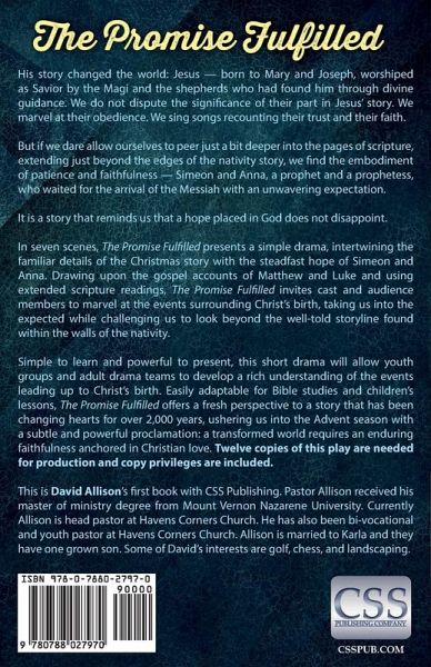 His story changed the world: Jesus -- born to Mary and Joseph, worshiped as Savior by the Magi and the shepherds who had found him through divine guidance. We do not dispute the significance of their part in Jesus' story. We marvel at their obedience. We sing songs recounting their trust and their faith. But if we dare allow ourselves to peer just a bit deeper into the pages of scripture, extending just beyond the edges of the nativity story, we find the embodiment of patience and faithfulness -- Simeon and Anna, a prophet and a prophetess, who waited for the arrival of the Messiah with an unwavering expectation. It is a story that reminds us that a hope placed in God does not disappoint. In seven scenes, The Promise Fulfilled presents a simple drama, intertwining the familiar details of the Christmas story with the steadfast hope of Simeon and Anna. Drawing upon the gospel accounts of Matthew and Luke and using extended scripture readings, The Promise Fulfilled invites cast and audience members to marvel at the events surrounding Christ's birth, taking us into the expected while challenging us to look beyond the well-told storyline found within the walls of the nativity. Simple to learn and powerful to present, this short drama will allow youth groups and adult drama teams to develop a rich understanding of the events leading up to Christ's birth. Easily adaptable for Bible studies and children's lessons, The Promise Fulfilled offers a fresh perspective to a story that has been changing hearts for over 2,000 years, ushering us into the Advent season with a subtle and powerful proclamation: a transformed world requires an enduring faithfulness anchored in Christian love. Twelve copies of this play are needed for production and copy privileges are included. This is David Allison's first book with CSS Publishing. Pastor Allison received his master of ministry degree from Mount Vernon Nazarene University. Currently Allison is head pastor at Havens Corners Church. He has also been bi-vocational and youth pastor at Havens Corners Church. Allison is married to Karla and they have one grown son. Some of David's interests are golf, chess, and landscaping.