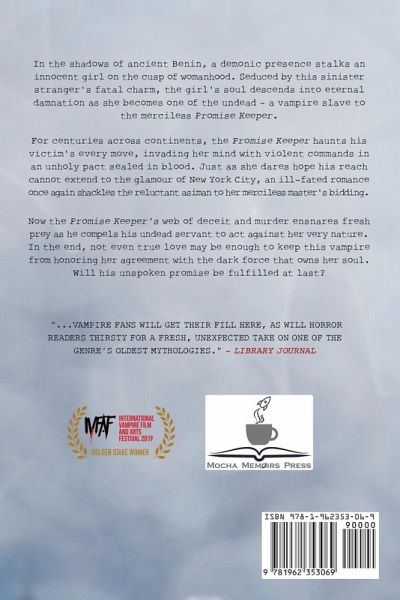 In the shadows of ancient Benin, a demonic presence stalks an innocent girl on the cusp of womanhood. Seduced by this sinister stranger's fatal charm, the girl's soul descends into eternal damnation as she becomes one of the undead - a vampire slave to the merciless Promise Keeper. For centuries across continents, the Promise Keeper haunts his victim's every move, invading her mind with violent commands in an unholy pact sealed in blood. Just as she dares hope his reach cannot extend to the glamour of New York City, an ill-fated romance once again shackles the reluctant asiman to her merciless master's bidding. Now the Promise Keeper's web of deceit and murder ensnares fresh prey as he compels his undead servant to act against her very nature. In the end, not even true love may be enough to keep this vampire from honoring her agreement with the dark force that owns her soul. Will his unspoken promise be fulfilled at last?