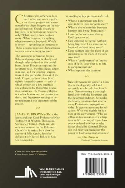 Christians who otherwise love each other and work together on shared projects and causes nonetheless often disagree on the subject of baptism. Should infants be baptized, or is baptism for believers only? What exactly does baptism mean? What happens, if anything, when someone is baptized? Which is better -- sprinkling or immersion? These disagreements are disheartening to some and confusing to many. The sacrament of baptism from a Reformed perspective is clearly and thoughtfully outlined in this useful book. James Brownson explains the scriptural basis, the theological underpinnings, and the practical implications of this particular element of the faith. Organized into thirty brief, tightly focused chapters -- each of which centers on a key question -- and enhanced by thoughtful discussion questions, The Promise of Baptism will be an important resource for pastors, students, and laypersons seeking to better understand this sacrament that lies at the heart of the church's life. A sampling of key questions addressed: What is a sacrament, and how does it differ from an "ordinance"? What's the relationship between baptism and being "born again"? How do the sacraments bring God's grace to us? Can someone be "saved" without being baptized? Can someone be baptized without being saved? Does baptism take the place of circumcision as the mark of the new covenant? What is "confirmation" or "profession of faith," and what is its relationship to baptism? What happens after baptism?