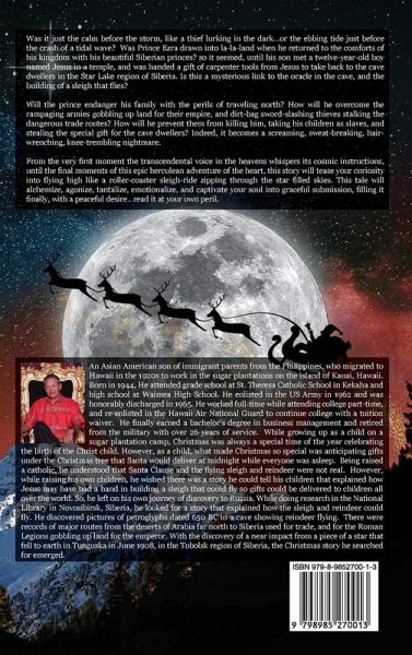 Was it just the calm before the storm, like a thief lurking in the dark...or the ebbing tide just before the crash of a tidal wave? Was Prince Ezra drawn into la-la-land when he returned to the comforts of his kingdom with his beautiful Siberian princes? so it seemed, until his son met a twelve-year-old boy named Jesus in a temple, and was handed a gift of carpenter tools from Jesus to take back to the cave dwellers in the Star Lake region of Siberia. Is this a mysterious link to the oracle in the cave, and the building of a sleigh that flies? Will the prince endanger his family with the perils of traveling north? How will he overcome the rampaging armies gobbling up land for their empire, and dirt-bag sword-slashing thieves stalking the dangerous trade routes? How will he prevent them from killing him, taking his children as slaves, and stealing the special gift for the cave dwellers? Indeed, it becomes a screaming, sweat-breaking, hair-wrenching, knee-trembling nightmare. From the very first moment the transcendental voice in the heavens whispers its cosmic instructions, until the final moments of this epic herculean adventure of the heart, this story will tease your curiosity into flying high like a roller-coaster sleigh-ride zipping through the star filled skies. This tale will alchemize, agonize, tantalize, emotionalize, and captivate your soul into graceful submission, filling it finally, with a peaceful desire...read it at your own peril.