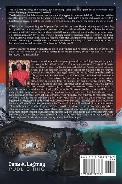 This is a road-twisting, cliff-hanging, gut wrenching, heart-breaking, quest-driven story that whip-cracks the struggle between good and evil. Was the star over Bethlehem more than just a star that appeared on a celestial clock, or was it on a divine clock that ushered in peace for the warring cave dwellers, and guided a prince to discover fragments of that star, and became a tool for the oracle in a cave to prepare the way for the birth of the Christ child? Will the prince complete his quest for peace after surviving the bitter Siberian Mountains and marching through the deep burning sun-parched sands of the slave-trade wastelands? Can he defeat the ruthless fur-traders, evil-stinking robbers, and mean-as-hell soldiers after being smitten by a ravishing beauty of a Siberian princess? Or will her ferocious Siberian grizzly guardian ravish him instead? ...and what of the mysterious oracle who lives in the foothills of the Star Lake region wandering the dark halls of his candlelit cave telling stories of ancient warring cave dwellers and a fiery star? What role does he play in this tale of wonder and treachery, "The Promise of Christmas"? Discover how St. Nicholas and his flying sleigh and reindeer had its origins with the prince and his family...and how Christmas was first celebrated to include the building of the sleigh and why it flies in the Sequel, "The Sleighmaker"