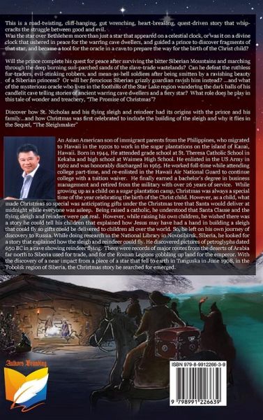 This is a road-twisting, cliff-hanging, gut wrenching, heart-breaking, quest-driven story that whip-cracks the struggle between good and evil. Was the star over Bethlehem more than just a star that appeared on a celestial clock, or was it on a divine clock that ushered in peace for the warring cave dwellers, and guided a prince to discover fragments of that star, and became a tool for the oracle in a cave to prepare the way for the birth of the Christ child? Will the prince complete his quest for peace after surviving the bitter Siberian Mountains and marching through the deep burning sun-parched sands of the slave-trade wastelands? Can he defeat the ruthless fur-traders, evil-stinking robbers, and mean-as-hell soldiers after being smitten by a ravishing beauty of a Siberian princess? Or will her ferocious Siberian grizzly guardian ravish him instead? ...and what of the mysterious oracle who lives in the foothills of the Star Lake region wandering the dark halls of his candlelit cave telling stories of ancient warring cave dwellers and a fiery star? What role does he play in this tale of wonder and treachery, "The Promise of Christmas"? Discover how St. Nicholas and his flying sleigh and reindeer had its origins with the prince and his family...and how Christmas was first celebrated to include the building of the sleigh and why it flies in the Sequel, "The Sleighmaker"